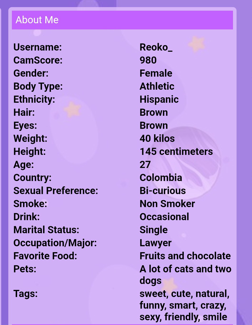 Era webcamer, salía con el usuario de babee_boo en chatur y cuteangel_m en strip, pero dejó de transmitir hace un tiempo y no tengo ni idea donde poder encontrarla