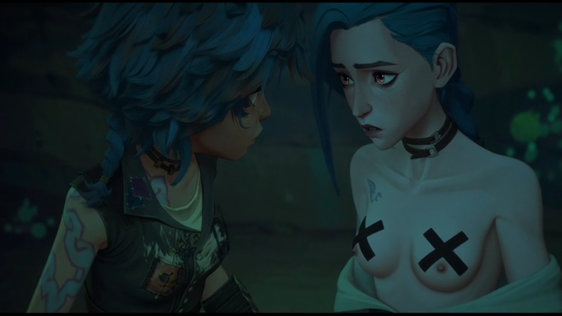 -Accidentalmente se levanta su top de cuero revelando pequeñas pezoneras en forma de X de color negro-