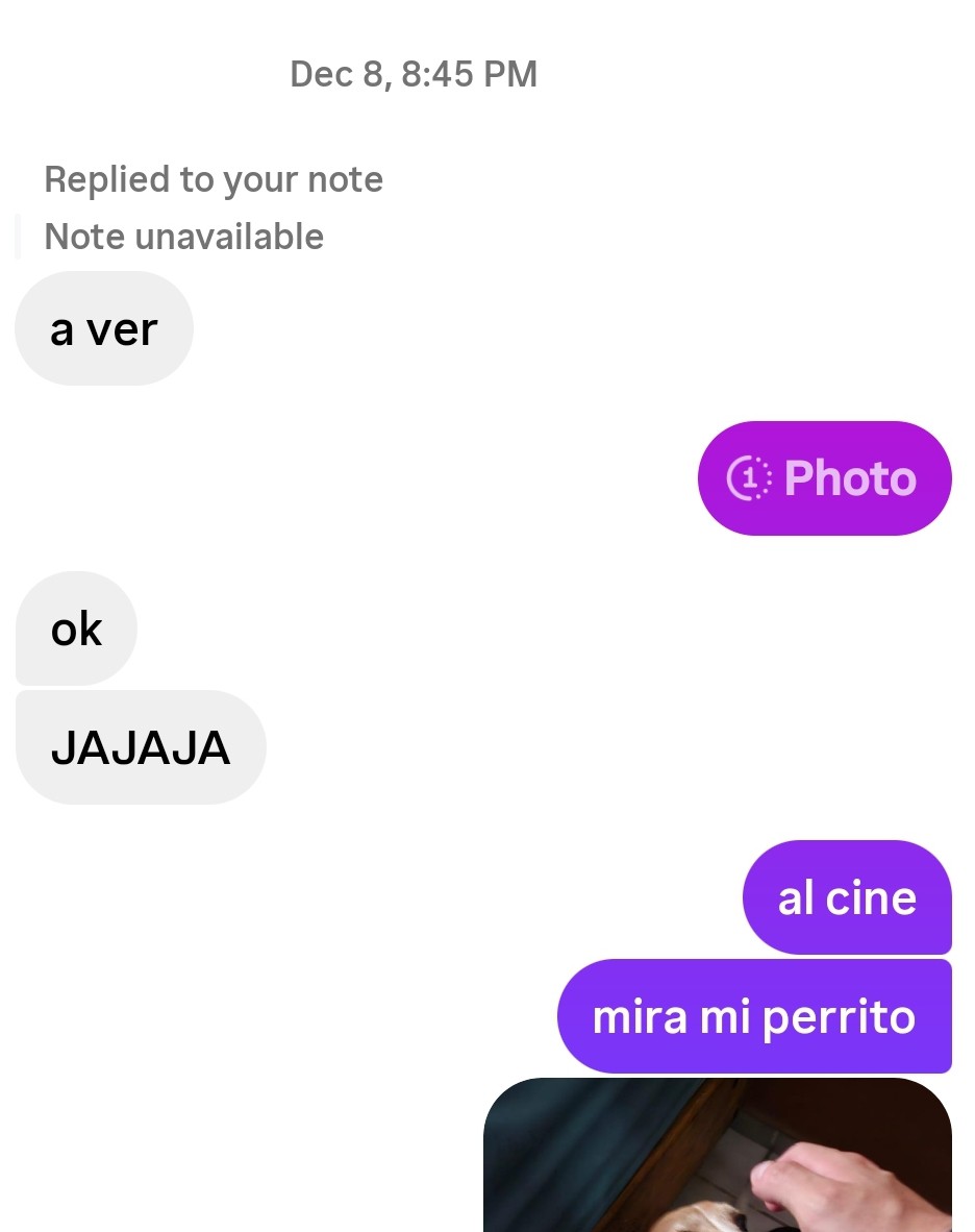 Contexto de esto, ella es una chica con la que llevo hablando bastante rato, en general no me interesa pero me da risa hablar con ella, nuestras conversaciones son siempre puras tonterías y estupideces pero hay veces en las que ella a tratado de sacar temas sexuales a lo que yo le respondo con otra estupidez; esto lo hago solo para subirme el ego de saber que ella quiere conmigo, pero directamente no me llama la atención ella ya que es algo gorda; en su cuenta siempre sube fotos mostrando el culo en close friends y cada que subo fotos mías normales le da like a mis historias. Un día puse en notas que se me veía muy bien mi pecho, ella me responde que quiere ver pero le mando una foto efímera de mi perro, por eso me pone el "ok jajajaj" y luego otra foto permanente de mi perro.